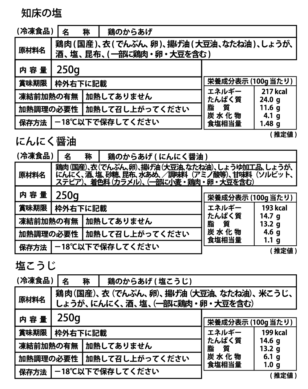 ¥4,000 (税込) 知床からあげ むね レンチンセット【知床の塩、にんにく醤油、塩こうじ】各250g×1パック=750gーーーーー知床の恵みの詰まった一品です。ーーーーー商品一括表示(タッチすると拡大できます)在庫切れ カテゴリー: レンチンタイプ関連商品 鶏のからあげ もも レンチンセット【鶏のからあげ】 300g×3パック=900g ¥4,000 (税込) お買い物カゴに追加 知床からあげ もも レンチンセット【知床の塩、にんにく醤油、塩こうじ】 各250g×1パック=750g ¥4,900 (税込) 続きを読む